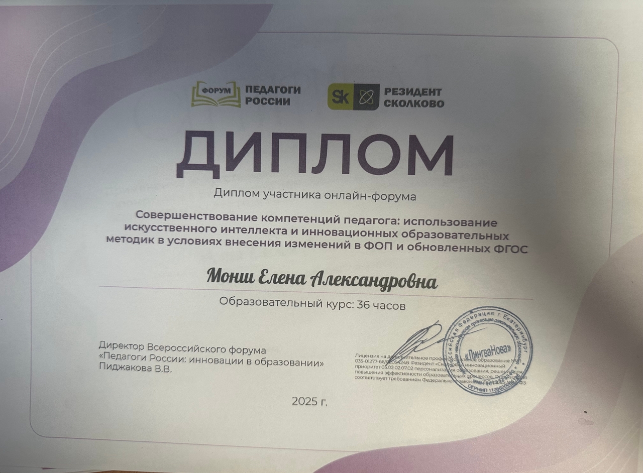 Диплом Совершенствование компетенций педагога: использование искусственного интеллекта и инновационных образовательных методик в условиях внесения изменений в ФОП и обновленных ФГОС. 36 часов. Всероссийский форум «Педагоги России: инновации в образовании» 20.11.2025г .